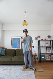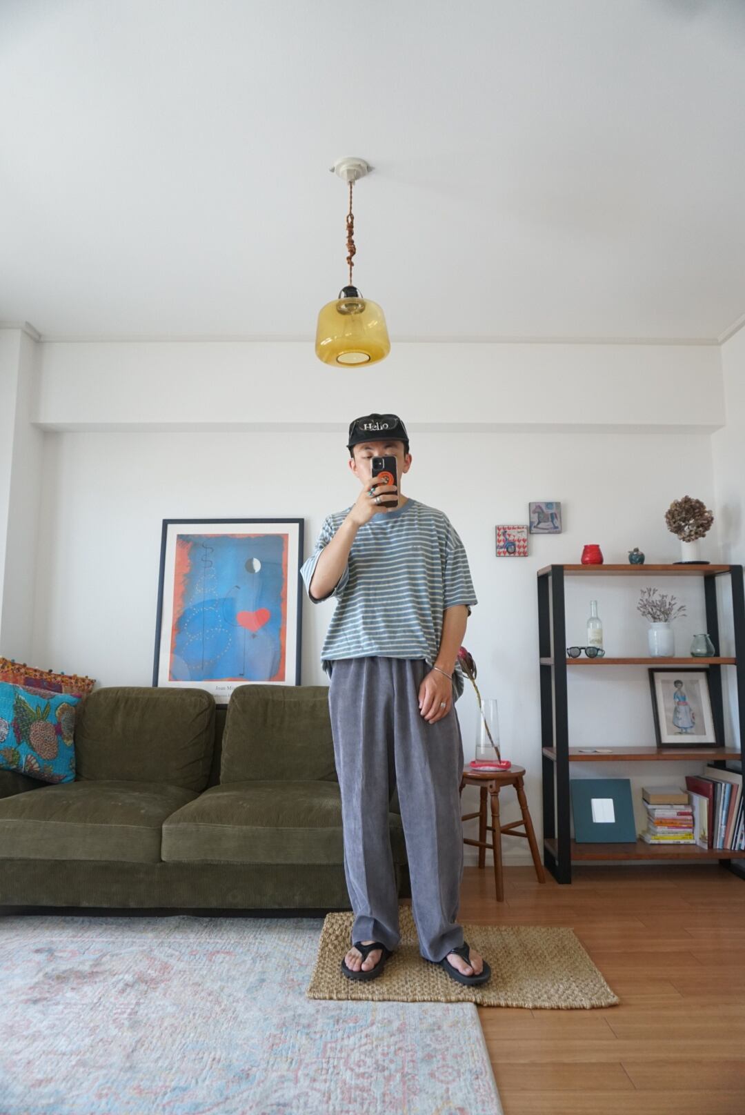 くすんだグレーのイージーパンツ。コーデュロイのような生地感がグッドです。